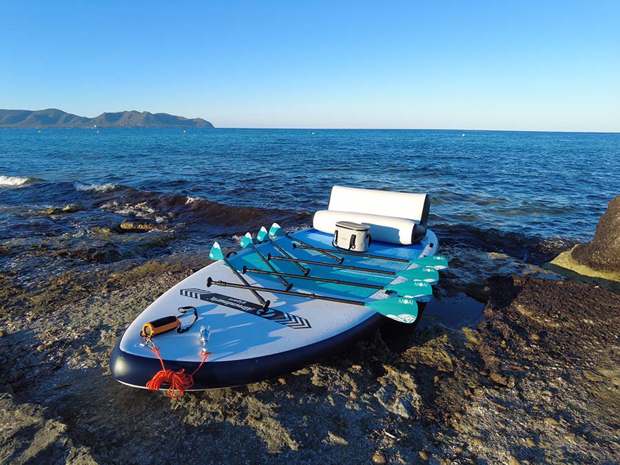 Ein riesiges SUP mit extremer Stabilität – für bis zu 8 Personen! Und damit der Spaß in der Gruppe noch gigantischer wird, bieten wir euch erstklassiges Zubehör für eure ganz private Badeinsel.